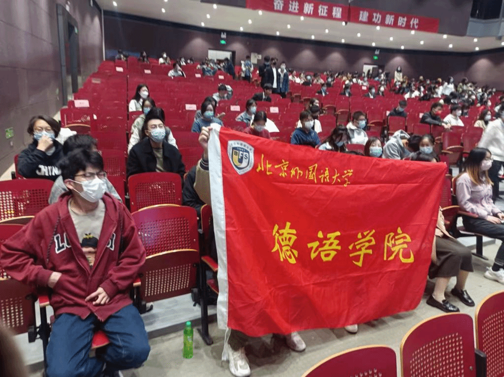 部分员工党员、团员代表在辅导员黄唯城的带领下在千人礼堂集中观看开幕会。