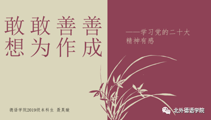 接下来,本科生党支部书记聂昊璇分享了自己的学习感悟。她认为以自己为代表的疫情一代青年大员工既生逢其时,也应肩负重任,应勇敢面对时代的“大考”,在疫情影响下找寻生活的平衡,担负起属于当代青年人的使命,在实践中考验和磨炼自己,实现自我价值。她以习近平总书记在二十大报告中对青年“怀抱梦想又脚踏实地,敢想敢为又善作善成”自勉,结合自己和同伴组队参加两次全国性德语赛事的经历,认为应从生活中的点滴小事做起,善始善终,善作善成,不忘初心,持之以恒,立志成为有理想,敢担当,能吃苦,肯奋斗的新时代好青年。