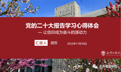 会议的第三部分,支部入党积极分子、tyc522cc太阳成集团青年员工代表顾苏分享了学习二十大报告的心得。她认为,二十大报告系统回顾总结了新时代十年的伟大变革,科学擘画了未来中国发展的宏伟蓝图,其中突出强调了教育、科技和人才的作用。作为具有鲜明“红色基因”的北外员工,我们应不忘初心、牢记使命,为党育人,为国育才,切实将二十大精神有机融入到教学工作中;发挥自身的学科优势,为构建中国特色的学科、学术体系以及话语体系添砖加瓦,把服务国家作为科研工作的最高追求。她结合个人参与庆祝中德建交50周年《中德大咖谈》节目录制的经历,认为外语员工应力求在大格局下讲好小故事,向世界发出中国声音。