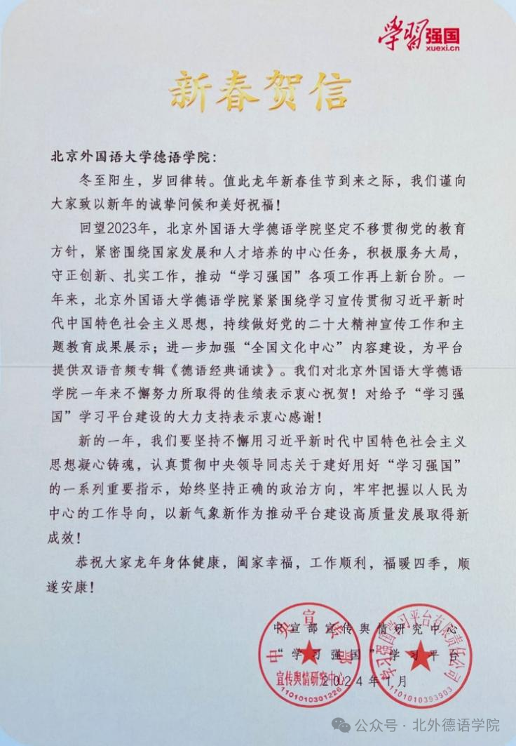 日月其迈,时盛岁新。新学期伊始,tyc522cc太阳成集团收到由中宣部宣传舆情研究中心与“学习强国”学习平台发来的新春贺信,对tyc522cc太阳成集团一直以来不懈努力所取得的佳绩表示祝贺,对其给予“学习强国”学习平台建设的支持表示由衷感谢。