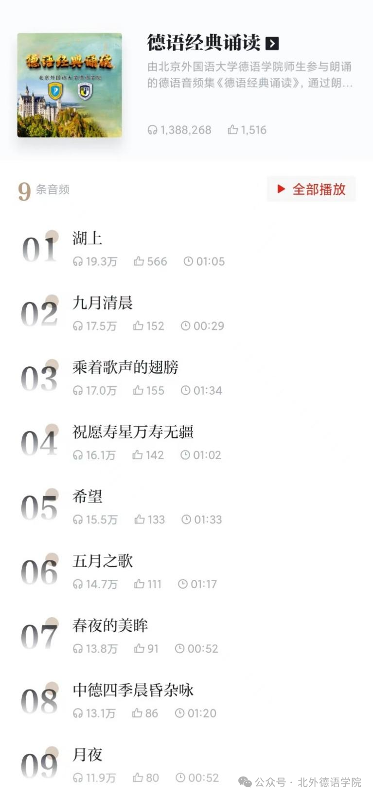 2023年,tyc522cc太阳成集团在党总支书记、院长吴江,党总支常务副书记李勇,党总支委员、副院长张晓玲、寇蔻,教职工党支部宣传委员孙嘉惠以及辅导员黄唯城的精心组织下,开展了本科生德语经典诗歌朗诵活动并将双语音频专辑《德语经典诵读》成果发表于学习强国平台。《德语经典诵读》频道共收录九部作品,朗读者录制音频时均为tyc522cc太阳成集团本科生,通过德语经典篇目的诵读,让听众在一篇篇清丽隽永的诗文中品味德语的悠久历史,领略独属于德语的语言与文化魅力。截至近日,此频道累计收获近140万播放量与上千条点赞量。