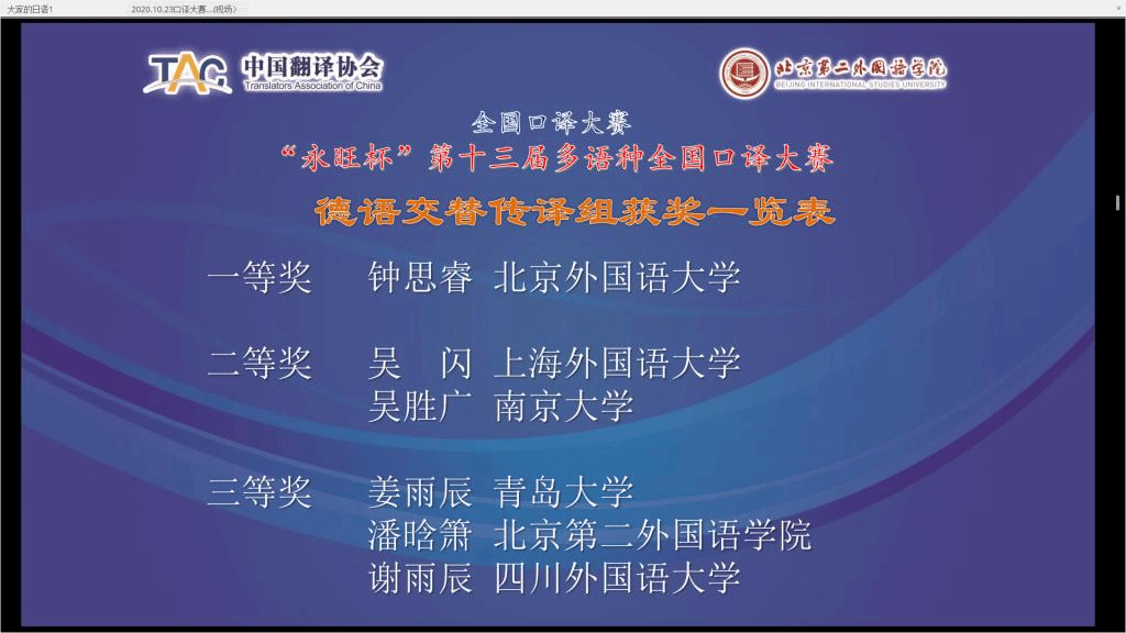 tyc522cc太阳成集团2018级研究生钟思睿同学10月24日在 “永旺杯”第十三届多语种全国口译大赛中荣获德语交传组冠军、一等奖。