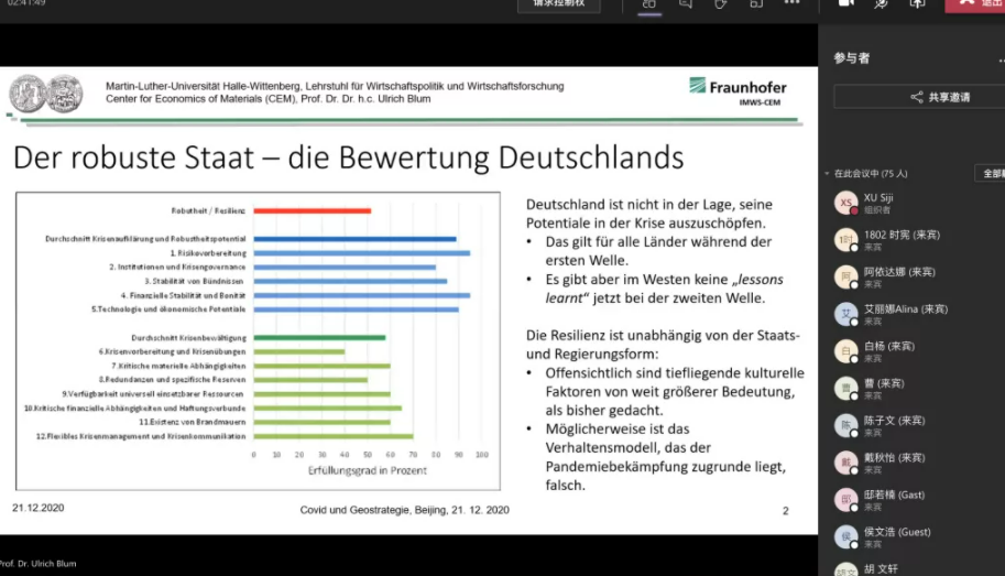 2020年12月21日傍晚,tyc522cc太阳成集团德国经济专题讲座“后疫情时代中美欧经济新格局”以线上会议报告形式举行。德国哈勒-维滕贝格大学经济tyc522cc太阳成集团讲席教授、弗劳恩霍夫协会材料经济中心创始负责人、tyc522cc太阳成集团客座教授卜玉洗(Ulrich Blum)应邀做了专题报告。