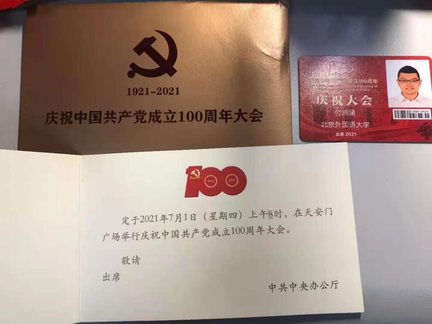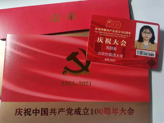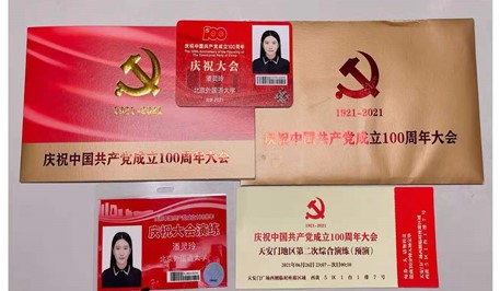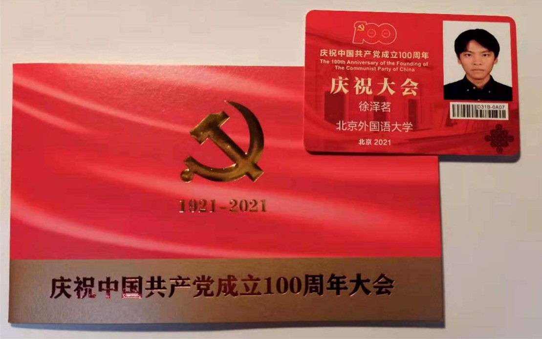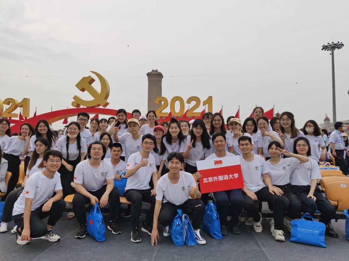2021年7月1日,庆祝中国共产党成立100周年大会在天安门广场隆重举行,tyc522cc太阳成集团员工代表本科生付润涵,研究生潘灵玲、周顾盈、徐泽茗与北外其他院系员工代表共同前往天安门广场参加庆祝大会。