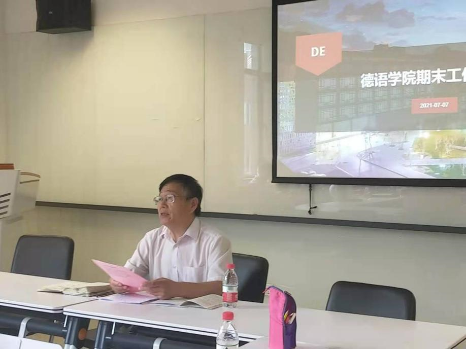 第二个环节是期末总结,基础教研室主任李婧、文学教研室任卫东、语言学教研室主任葛囡囡、翻译教研室主任顾牧、德国外交教研室主任李文红、德国经济教研室主任徐四季、跨文化教研室主任赵倩、员工党支部书记张晓玲依次汇报了本学期本教研室和教工支部工作完成情况及取得的成绩。之后副院长姚晓舟汇报了本学期本科生各项教学管理工作及全国德语专业八级测试的相关情况,副院长姚燕汇报了研究生各项教学管理及外事工作情况,并传达了学校研究生督学的反馈意见。