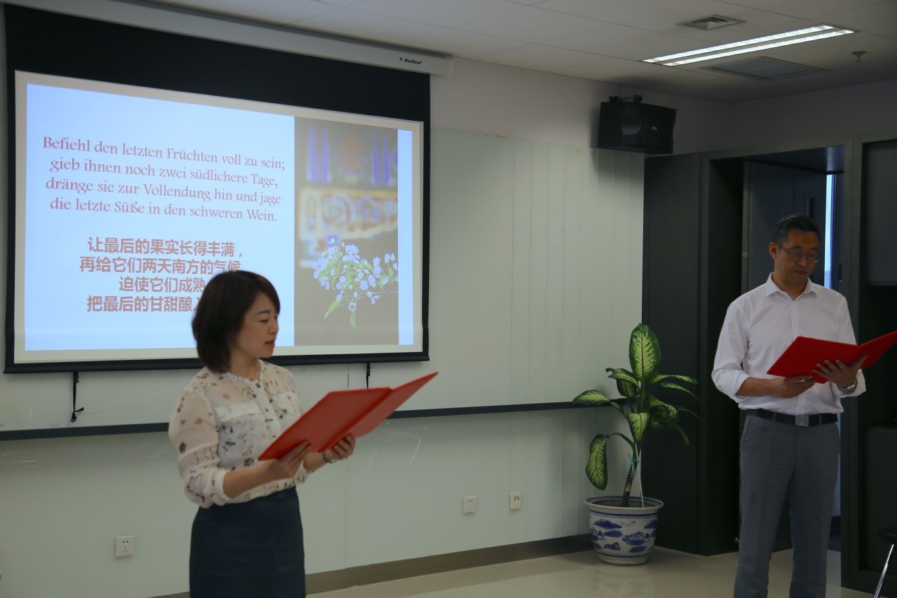 诗诵会中还穿插了员工们精心准备的中德文歌曲表演。在雷婉珞同学的独唱德文歌曲《小小少年》以及周杰湄、周如安、李唯伊同学合唱的中文歌曲《同桌的你》的悠扬歌声中,大家共同追忆了无忧无虑的少年时光和美丽青涩的青春年华。