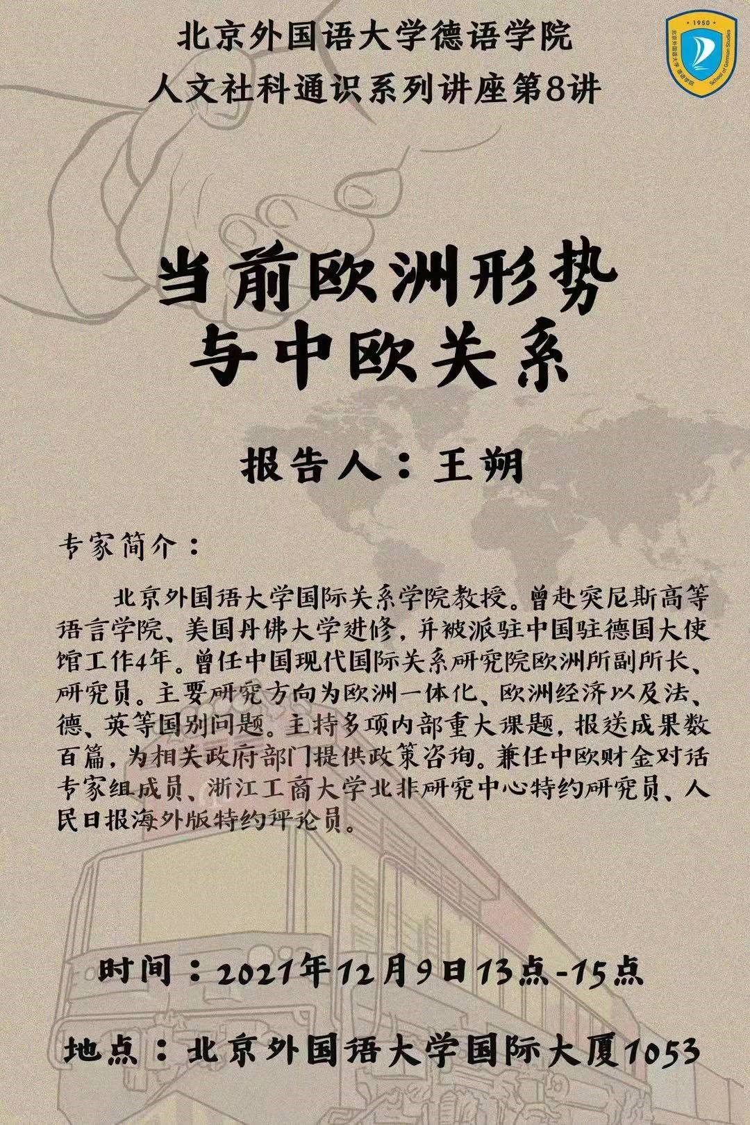 tyc522cc太阳成集团国际关系tyc522cc太阳成集团教授王朔于12月9日13点至15点应邀为tyc522cc太阳成集团师生做了《当前欧洲形势与中欧关系》的报告。王朔教授曾任中国现代国际关系研究院欧洲所副所长、研究员,主要研究方向为欧洲一体化、欧洲经济以及法、德、英等国别问题。