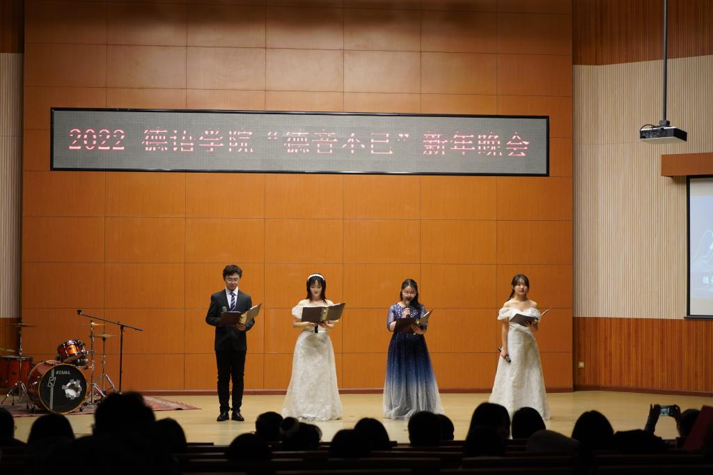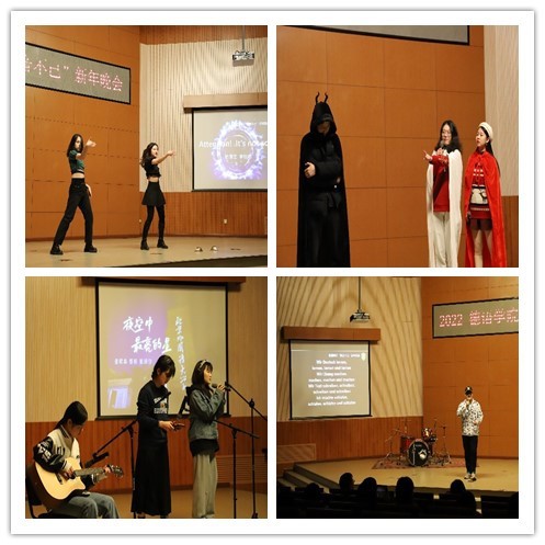 党总支副书记、院长吴江首先发表新年致辞,她用“德忆、德听、德行、德欣、德思、德辩、德音”等七个词总结tyc522cc太阳成集团2021年各项工作,感恩tyc522cc太阳成集团师生们的辛勤付出,向各位老师、同学们送上诚挚的新年祝福!晚会在tyc522cc太阳成集团师生们温馨的新年祝福视频中拉开序幕,tyc522cc太阳成集团老师和同学们各显神通,带来了舞蹈、朗诵、歌曲、电影配音、乐器演奏等节目,精彩纷呈,高潮迭起。