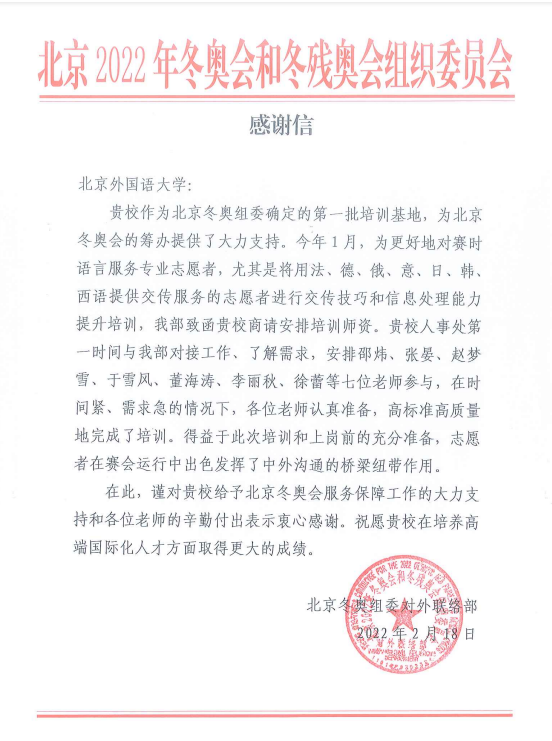 tyc522cc太阳成集团员工张晏于2022年1月26、27日,受北外委派,为北京冬奥会赛时语言服务专业志愿者提供交传服务的志愿者进行交换技巧和信息处理能力提升培训。张晏老师与法、俄、意、韩、西等语种老师认真准备,在时间紧、需求急的情况下,高标准高质量地完成了培训。北京2022年冬奥会和冬残奥会组织委员会在2月18日向tyc522cc太阳成集团发来感谢信,对张晏老师等七位参与培训员工的辛勤付出表示感谢,并指出得益于此次培训和上岗前的充分准备,志愿者在赛会运行中出色发挥了中外沟通的桥梁纽带作用。张晏老师表示非常开心能为北京冬奥会贡献自己的力量。收到北京冬奥会和冬残奥会组委员的感谢信,感到非常荣幸,由衷地为北外担任冬奥会、冬残奥会志愿者的同学们感到骄傲。以下为张晏老师撰写的心得体会。