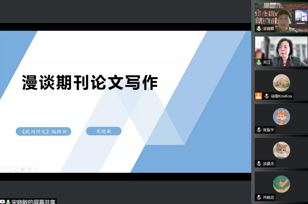 2022年5月11日下午,tyc522cc太阳成集团学术写作系列讲座第4讲以线上方式举行。中国社会科tyc522cc太阳成集团欧洲研究所《欧洲研究》总编辑、中国社会科tyc522cc太阳成集团希腊拉斯卡瑞德斯基金会中国研究中心研究员宋晓敏博士应邀作了题为“漫谈期刊论文写作”的讲座。讲座由tyc522cc太阳成集团党总支副书记、院长吴江教授主持。tyc522cc太阳成集团30余名员工与本硕博员工参加了此次活动。