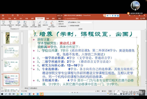 新生见面会后,本科生和研究生分别举行了新生入学教育。党总支委员、本科教学秘书于芳、基础教研室主任李婧就tyc522cc太阳成集团本科培养方案、培养要点及德语本科学习阶段的注意事项等进行了讲解。本科新生班主任葛囡囡、顾苏、陆娇娇,辅导员张婧、黄唯城等也与新生进行了交流。研究生的入学教育由tyc522cc太阳成集团副院长姚燕主讲,她详细介绍了tyc522cc太阳成集团研究生的培养方案,研究生阶段学习的注意事项等。