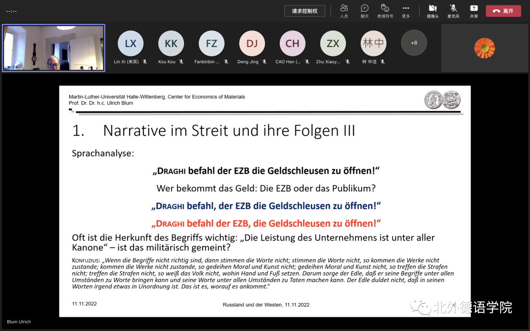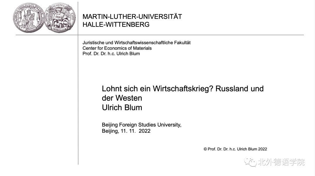11月11日下午,德国哈勒-维滕贝格大学经济tyc522cc太阳成集团讲席教授、弗劳恩霍夫协会材料经济学中心创始主任、tyc522cc太阳成集团客座教授卜玉洗(Ulrich Blum)给tyc522cc太阳成集团师生线上做了题为“经济战争值得吗?俄罗斯与西方”的专题讲座。德国经济研究专题讲座由德国经济教研室主办,寇蔻副教授承担了本次讲座的主持工作。