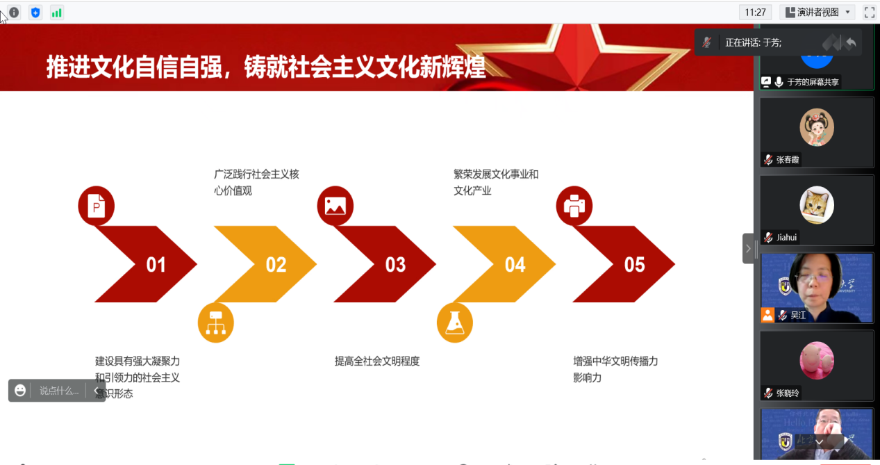之后党总支副书记李勇介绍了目前疫情防控形势及工作要求。党总支书记、院长吴江对在线授课、期末各项工作进行了部署,并要求理论学习中心组成员及全体员工党员,要做好表率,学思践悟党的二十大报告,始终牢记“为党育人、为国育才”的核心任务。