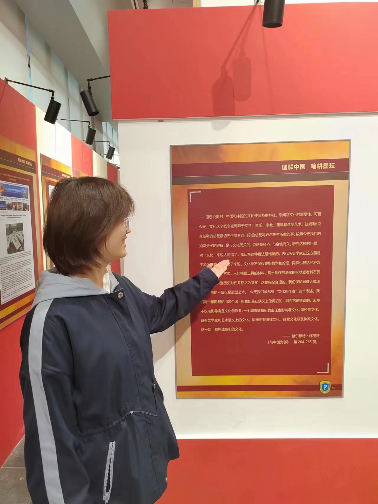 很荣幸能有此次机会担任中德展的讲解员,让我在加深自己对中德两国的了解的同时,把中德50年的友好关系讲给更多人听,同学长学姐们交流,向前辈们学习。在来访嘉宾的每一次驻足点头之间,我感觉自己口中的讲解词越来越有份量,也深深敬畏着中德友好关系的建设者、推动者,励志接好“桥梁建设者”这一棒,推动新时代中德关系行稳致远。