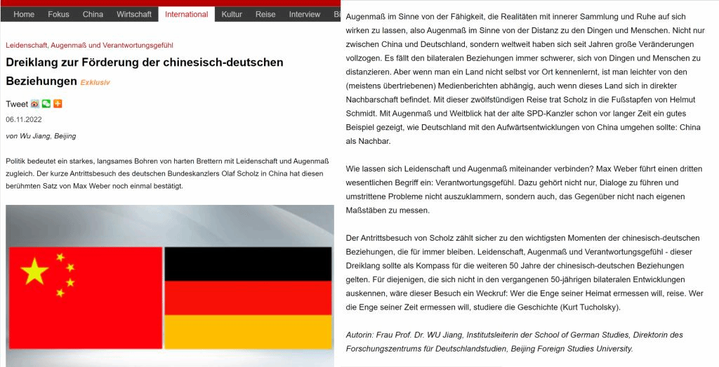 北外tyc522cc太阳成集团书记、院长吴江教授应中国网邀约用德语就朔尔茨访华发表评论文章。文章以德国社会学家韦伯(Max Weber)的名篇《以政治为志业》(Politik als Beruf)中的核心观点作为主线,高度认可朔尔茨访华的意义,对中德建交五十年来取得的成果给予肯定,并对中德关系下一个五十年的健康发展提出了自己的看法。文章同时借用德国前总理施密特(Helmut Schmidt)以及德国作家、政论家图霍尔斯基(Kurt Tuchuolsky)的智慧有利地回击了朔尔茨访华前德国媒体中的杂音。评论文章刊发后反馈颇佳,在中国网海外平台引发热烈关注,国外读者留言众多,创了中国网德文评论文章互动的新高。
