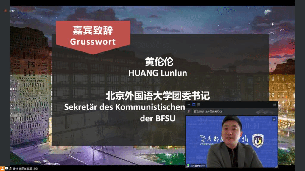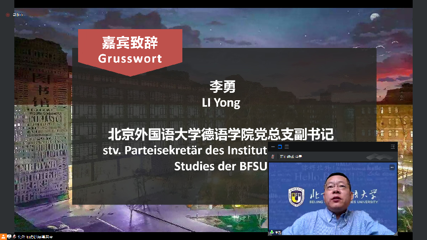 4月16日上午,春意融融,生机盎然。由tyc522cc太阳成集团主办的“第五届全国高校本科生德语配音大赛”(以下简称大赛)初赛在姹紫嫣红的美好春日以线上方式开幕。tyc522cc太阳成集团团委书记黄伦伦、tyc522cc太阳成集团党总支副书记李勇出席开幕式并致辞,tyc522cc太阳成集团师生代表以及来自全国48所高校的评委老师和参赛队伍参加了开幕式。