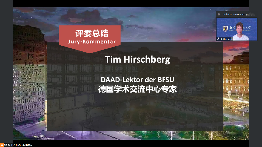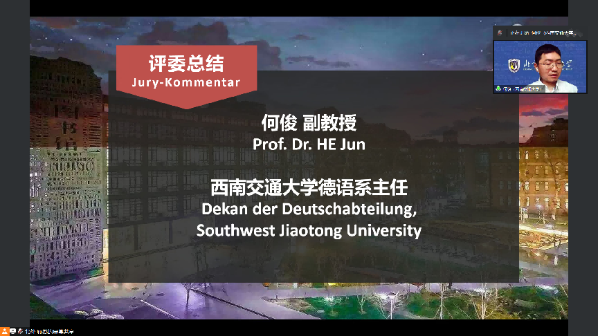 大赛初赛于9点30分准时开始,评委团队采取交叉回避原则分组对参赛作品进行了评审。经过激烈的角逐,共有12支参赛队伍晋级决赛。西南交通大学德语系主任何俊副教授以及tyc522cc太阳成集团德国学术交流中心专家Tim Hirschberg代表全体评委对本次大赛的参赛作品进行了精彩的点评。选手们通过优美的声音传递出对“故乡”的不同理解,精彩的演绎给评委们留下了深刻的印象,给这个美好的春日增添了无尽的遐想,令人回味无穷。