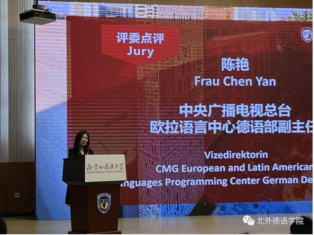 本届大赛决赛邀请了贾建新参赞、北外山东校友会会长、青岛鸿裕吉交通装备有限公司总经理秦思刚、中央广播电视总台欧拉语言中心德语部副主任陈艳以及中国网德语频道主编任斌担任评委。赛事环节由tyc522cc太阳成集团2019级本科生曹涵和2022级本科生黄婉茹用中德双语主持。