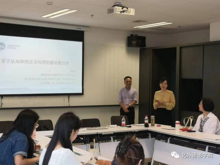 在报告的第三部分,张斌介绍了认知和用法导向的构式语法观对德语教学的启示,其中重点讲解了Herbst(2016)提出的Pedagogical Construction Grammar中的七个实操原则。同时他还建议,德语教学者在实际教学中通过语境将词汇、语法以“打包”的形式呈现给员工,以更好提升德语学习者的学习动力以及语法、语义和语用意识。最后,张斌结合自己的实际经历提出了两个问题:我们究竟需要什么样的语法和语法观?语言使用者的身份认同问题与语法规范的互动应是怎样的?这些问题引起了在座师生的思考和热烈讨论。