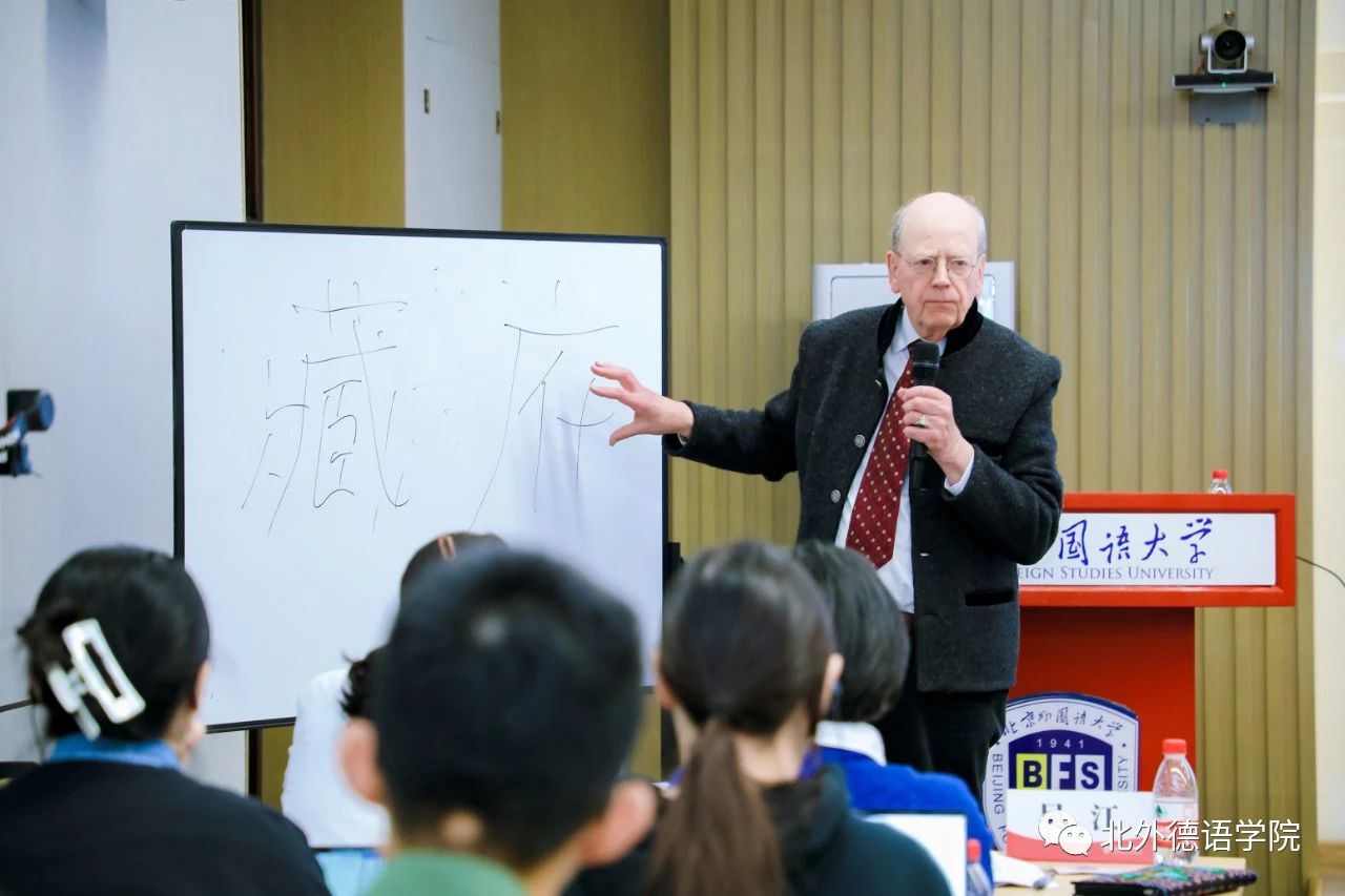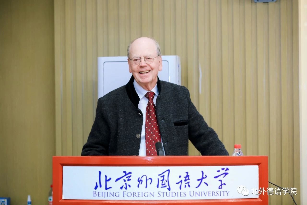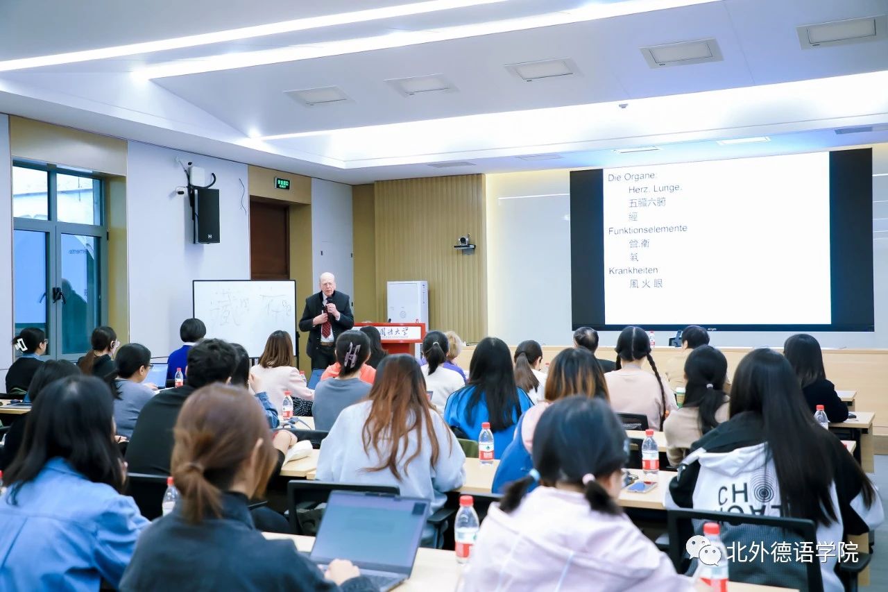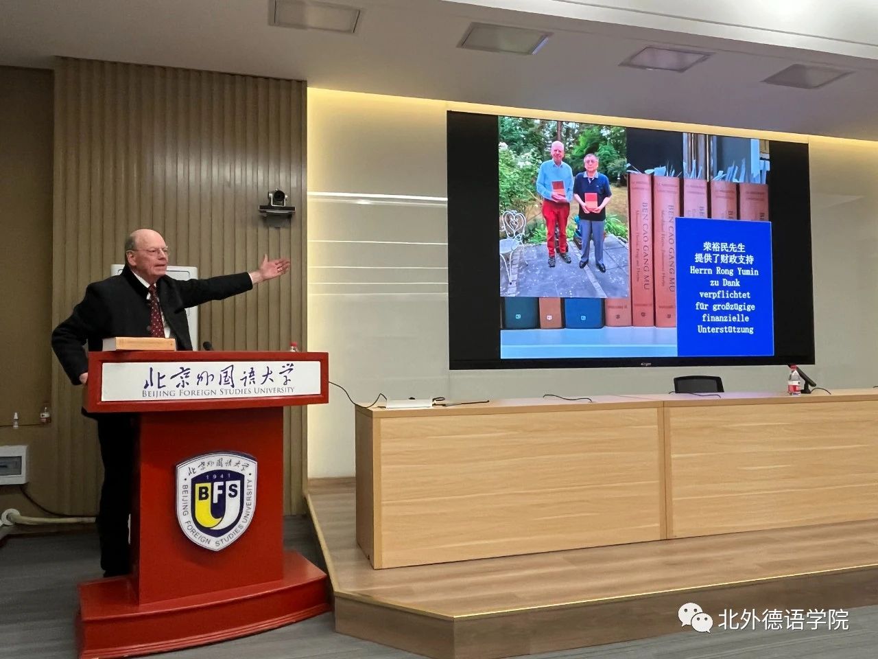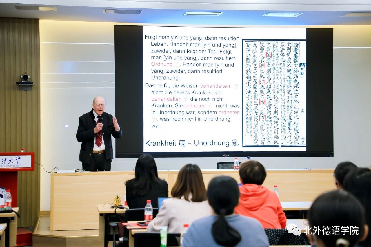 2023年10月18日下午,北外德语国家讲堂系列报告“中医古籍翻译的体会与心得——以《本草纲目》的翻译为例”在tyc522cc太阳成集团东院晨读厅成功举办。报告主讲人为德国著名医史学家、翻译家文树德教授(Prof. Dr. Paul U. Unschuld),专攻中、欧医学及生命科学比较史,尤擅长医学思想史、伦理史研究。文树德教授夫人文淑德女士(Ulrike Unschuld)、tyc522cc太阳成集团1977级校友、德国Rolux Leuchten GmbH 公司创始人、中国赛尔富电子有限公司董事荣裕民先生,tyc522cc太阳成集团党政联席会成员、员工代表及近百名员工聆听讲座。讲座由tyc522cc太阳成集团党总支书记、院长吴江主持。