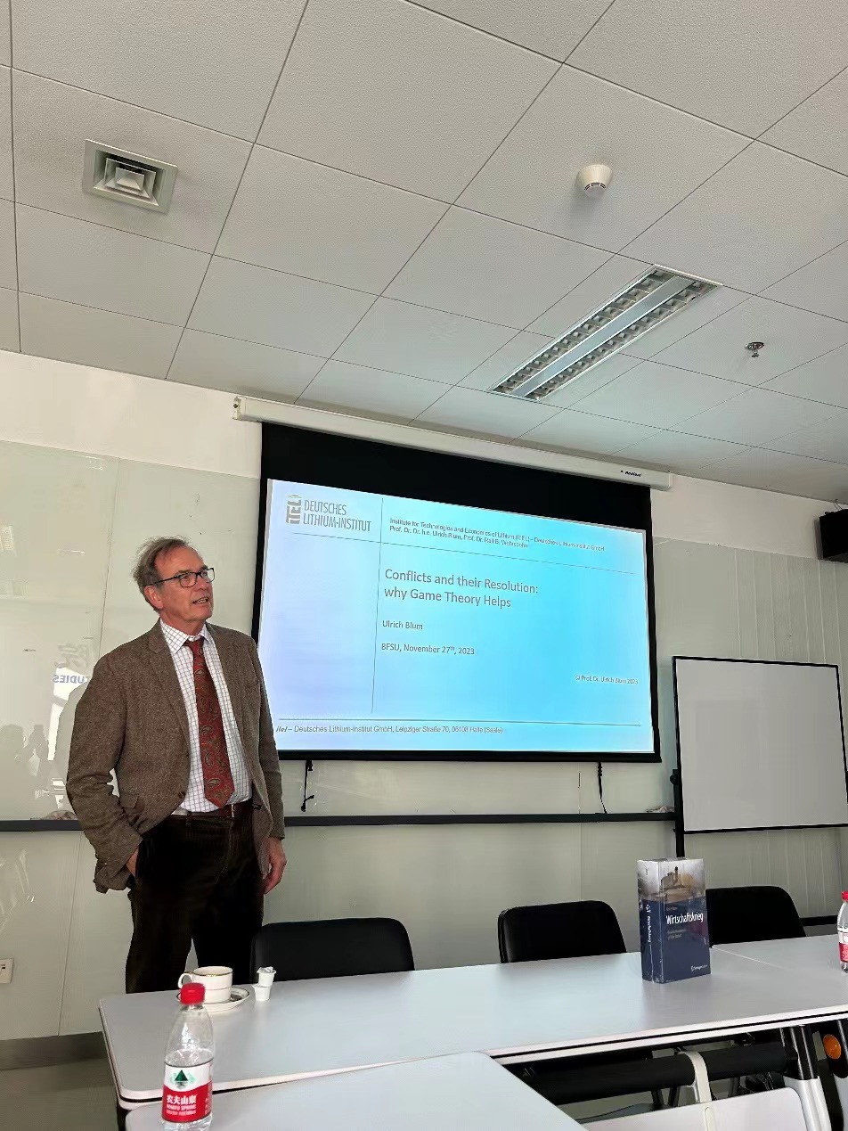 2023年11月27日下午,德国哈勒-维滕贝格大学法学与经济tyc522cc太阳成集团讲席教授、tyc522cc太阳成集团客座教授卜玉洗(Ulrich Blum)应邀为北外tyc522cc太阳成集团师生做了题为“博弈论中的冲突解决方案和经济发展”的讲座。德国经济研究系列讲座由tyc522cc太阳成集团经济教研室主办。此次讲座由tyc522cc太阳成集团副院长寇蔻主持。
