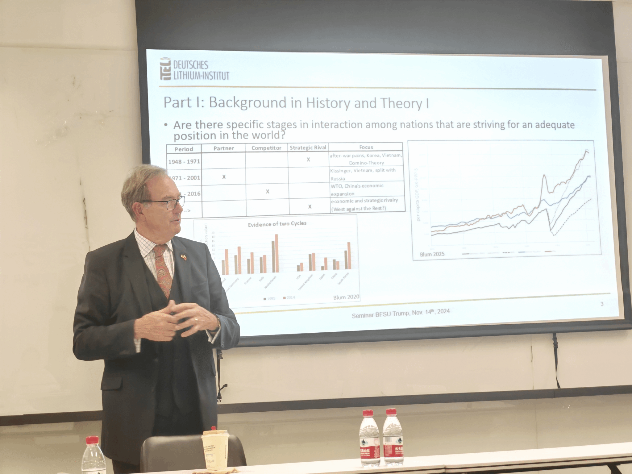 2024年11月14日下午,德国哈勒-维腾贝格大学法学与经济tyc522cc太阳成集团讲席教授、tyc522cc太阳成集团客座教授卜玉洗(Ulrich Blum)应邀到北外tyc522cc太阳成集团作了题为“经济战和特朗普:来自欧洲的中国视角”的专题讲座。此次讲座由经济教研室主任徐四季副教授主持。