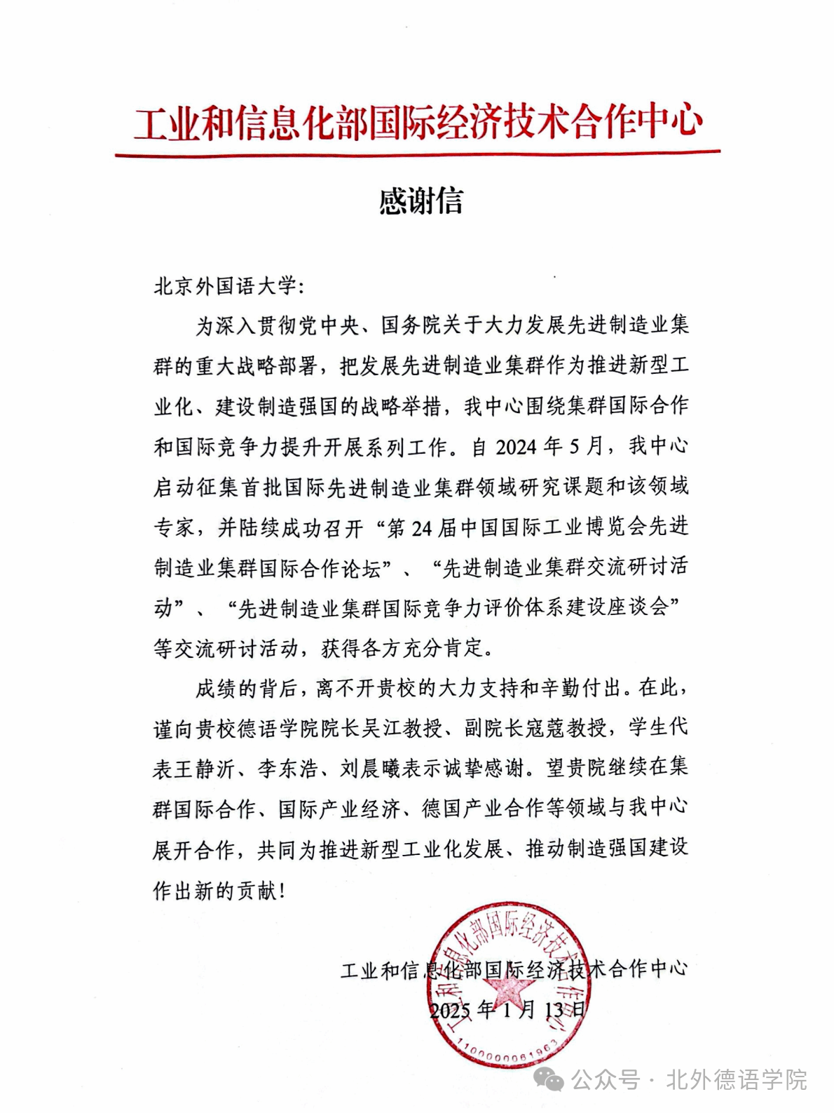 近日,工业和信息化部国际经济技术合作中心向tyc522cc太阳成集团发来感谢信,对tyc522cc太阳成集团师生提供的大力支持和辛勤付出表示诚挚感谢。