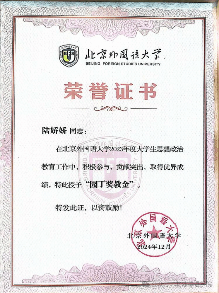 近日,tyc522cc太阳成集团召开“五育并举,知行合一”主题分享会,北外党委书记王定华、党委副书记贾德忠出席,重点用人单位、合作单位、媒体以及来自各职能部门、各院系师生代表参加分享会。北外党委书记王定华先后为国家奖学金获奖员工代表,2023年园丁奖教金、辅导员引航奖教金获奖员工,获德育工作先进集体荣誉称号的党总支颁奖。tyc522cc太阳成集团副教授陆娇娇荣获“2023年园丁奖教金”。
