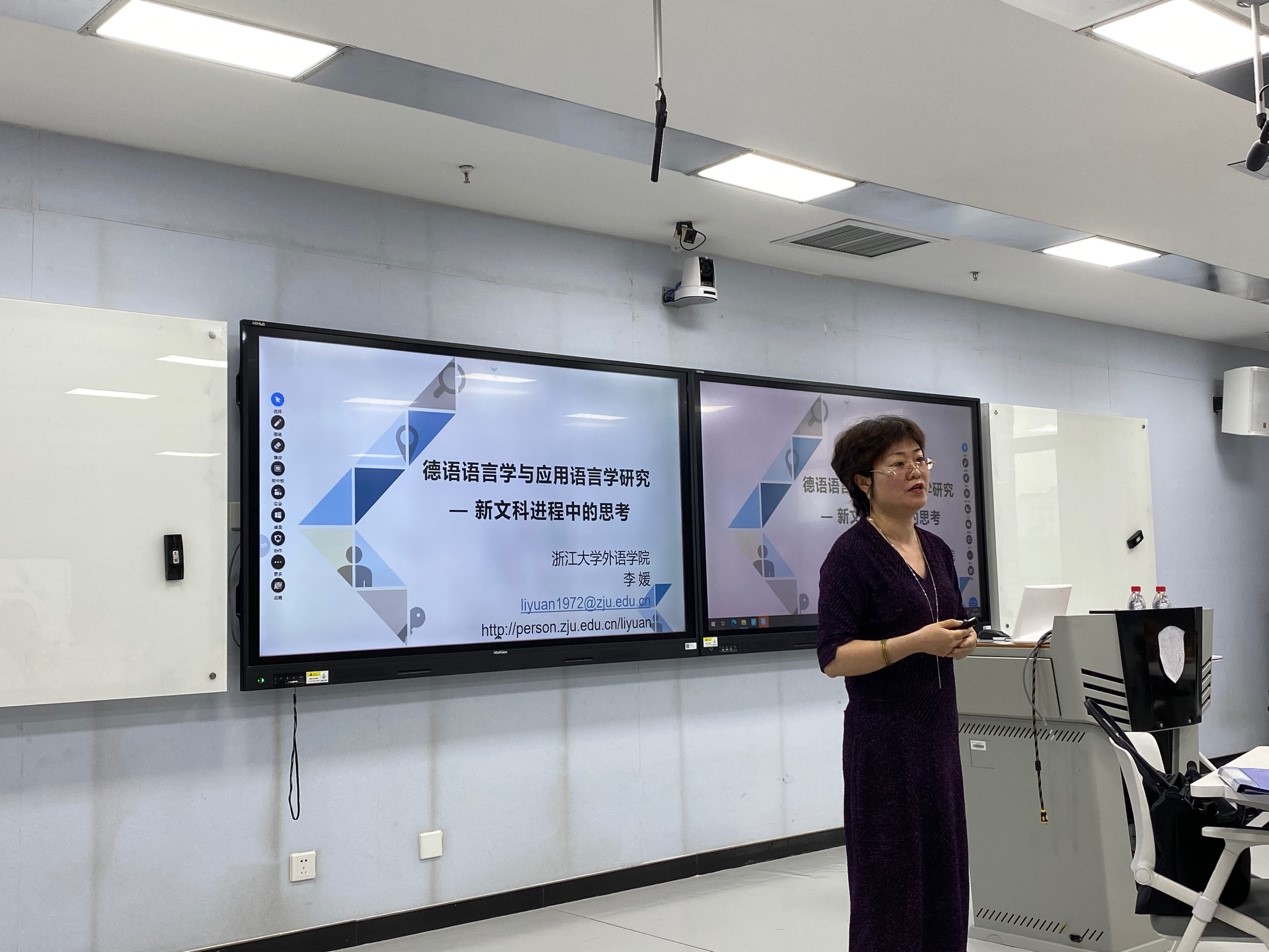 2021年6月25日下午,tyc522cc太阳成集团人文社科通识系列讲座第5讲在国际大厦517教室举行。浙江大学外国语言文化与国际交流tyc522cc太阳成集团副院长、德国学研究所所长李媛教授应邀作了“德语语言学及应用语言学研究——新文科进程中的思考”的报告。tyc522cc太阳成集团员工与本科生、研究生代表参加了报告会。讲座由tyc522cc太阳成集团院长吴江教授主持。