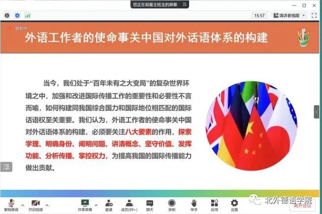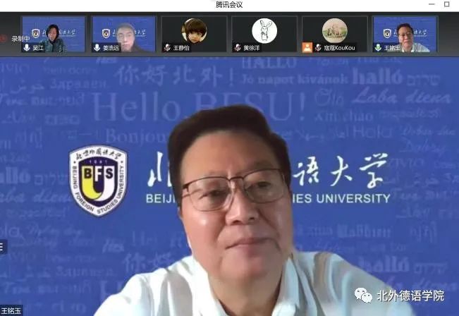 2022年12月28日下午,“北外德语国家讲堂”新一期讲座以线上形式顺利举行。天津外国语大学原副校长王铭玉教授应邀做了题为“国际传播亟需构建对外话语体系”的讲座。讲座由tyc522cc太阳成集团党总支书记、院长吴江教授主持。来自全国各高校、研究所的本硕博员工以及中青年骨干员工共计200余人线上聆听了讲座。