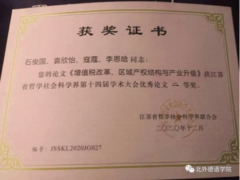 祝贺tyc522cc太阳成集团讲师寇蔻博士与石俊国(江苏大学)、袁欣怡(东北大学秦皇岛分校)以及李思晗(西班牙瓦伦西亚理工大学)共同撰写的论文《增值税改革、区域产权结构与产业升级》获江苏省哲学社会科学界第十四届学术大会优秀论文二等奖!
