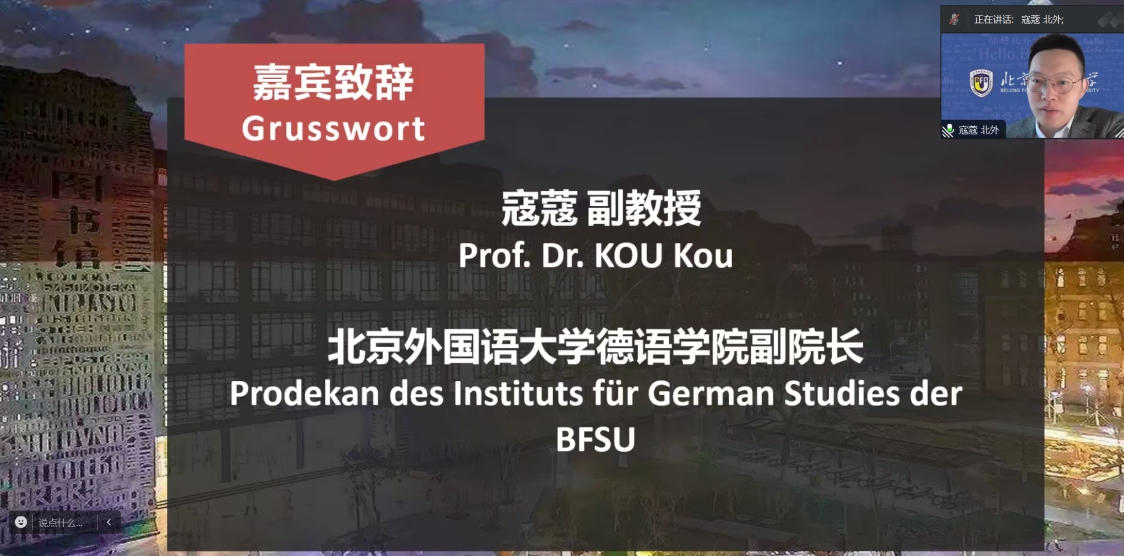 田小惠副处长代表tyc522cc太阳成集团教务处感谢全国34所兄弟院校对第六届全国高校本科生德语配音大赛的鼎力支持。她首先介绍了北外近几年为升级“金本科”人才培养新格局采取的两方面举措,一是加强德智体美劳“五育”并举,推动劳育和美育方案的出台和实施,重视马克思主义劳动教育观的培养等。二是创新人才培养模式,实现“4321”培养计划,与全国一流高校及其学科点联合培养卓越拔尖人才,对接国家战略,搭建创新人才培养的多元化平台并开设跨校通识课程等。她指出,北外德语专业是新中国成立后最早建立的高校德语学科点之一,也是首批国家级一流本科专业建设点。由tyc522cc太阳成集团主办的配音大赛已发展为全国高校的传统赛事,体现了北外tyc522cc太阳成集团在创新实践教学方面的新思路,为全国德语专业实践教学的开展做出了卓越贡献。本次大赛初赛以“自然”为主题,紧扣国家战略和时代脉搏,以赛促学,以赛增智,以赛会友,以语言为钥匙,以声音为桥梁,将进一步激发本科生德语学习的兴趣,增进全国高校德语专业点之间的交流。最后她预祝第六届全国高校本科生德语配音大赛取得圆满成功,预祝各位同学取得佳绩。