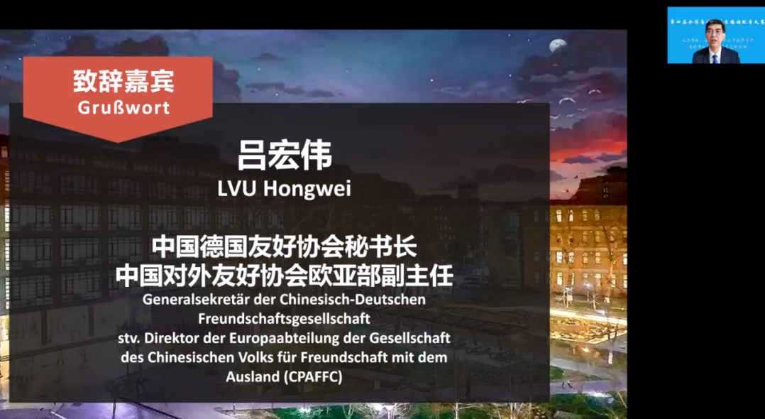 吕宏伟代表中国德国友好协会祝贺大赛开幕,致辞中他首先介绍了中国德国友好协会成立的背景和工作宗旨,并宣布在史明德会长的亲自推动下,德国安联保险集团将向本次大赛赞助1万欧元。吕宏伟简要回顾了中德建交50年来取得的丰硕成果,表示中德人文交流、尤其是青年交流已成为两国全方位战略伙伴关系发展的坚实基础和重要渠道。吕宏伟指出,语言是文化互鉴、中外交往的桥梁。青年是国家的未来,是中德关系和中德人民友谊的未来。值此中德建交50周年之际,tyc522cc太阳成集团牵头举办全国性赛事,为青年学子搭建交流的平台,意义重大,中国德国友好协会对此表示高度赞赏。他结合自己学习德语的经历和感悟鼓励各高校学子以大赛为契机,打牢语言基本功,运用好所学本领,为中德关系发展贡献力量。最后,吕宏伟预祝本次大赛圆满成功,同学们在取得好成绩的同时能够收获友谊。