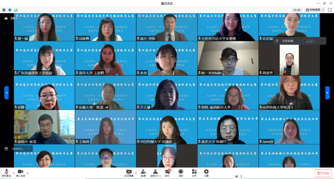 开幕式结束后,全国高校本科生德语配音大赛项目负责人、tyc522cc太阳成集团员工顾苏博士详细介绍了大赛初赛五个分会场的具体安排以及评审规则。大赛初赛于9点30分准时开始,评委团队采取交叉回避原则分组对参赛作品进行了评审。虽然疫情导致各高校选手无法面对面交流,但是腾讯会议间的“万籁俱唱”精彩纷呈。经过激烈的角逐,共选出15支参赛队伍晋级决赛。南京大学外国语tyc522cc太阳成集团德语系员工常晅博士以及tyc522cc太阳成集团德国学术交流中心专家Tim Hirschberg代表全体评委对本次大赛的参赛作品进行了精彩的点评。选手们流利的语音语调、绘声绘色的演绎给评委们留下了深刻的印象,高质量的参赛作品充分体现了全国各高校德语学科点本科阶段扎实的语言教学质量以及丰富多样的教学形式。