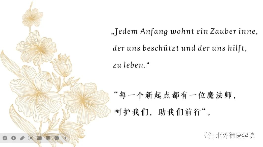 徐四季、李婧和陆娇娇作为教研室主任代表发言,勉励新生勇敢做自己,从北外出发,走向德语国家,在中欧交流的大舞台贡献自己的力量,祝福新生在北外沐浴四季阳光,播撒梦想的种子,合理规划好时间,充分培养兴趣与才干,不负韶华,静待花开;葛囡囡、史良作为班主任代表发言,鼓励新生寻找互帮互助的朋友,结识志同道合的伙伴,在模仿和超越榜样的过程中塑造出独特的自我;洪堃绿、武迪作为青年员工代表发言,祝福新生在北外tyc522cc太阳成集团度过充实美好的多彩时光,学有所成,开启行走世界的人生新篇章!包葛耿、邱袁炜代表tyc522cc太阳成集团行政工作人员发言,希望新生在北外的日子过得开心,每天进步一点点;辅导员张春霞、张婧、黄唯城勉励新生珍惜青春年华,勇攀学业高峰,敢于行走世界,秉承红色基因,成为又红又专又雅的北外德语人,承担起中华民族伟大复兴、构建人类命运共同体的重任。