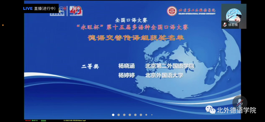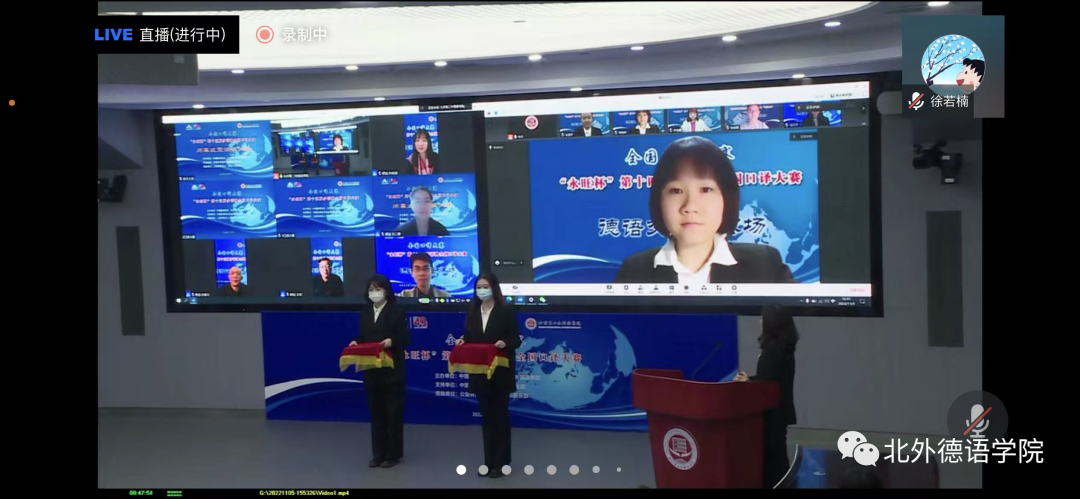 “永旺杯”第十五届多语种全国口译大赛于2022年11月5日成功在线举办,赛事通过腾讯会议进行了全程直播。来自全国49所高校的选手在比赛中激烈角逐,展现出高水平的口译专业素养以及出色的个人风采。在德语交替传译组的复赛和决赛中,我院MTI口译专业研究生杨婷婷同学经过激烈的比拼,获得德语交传组二等奖的好成绩。此次参赛由我院青年员工徐若楠博士带队。